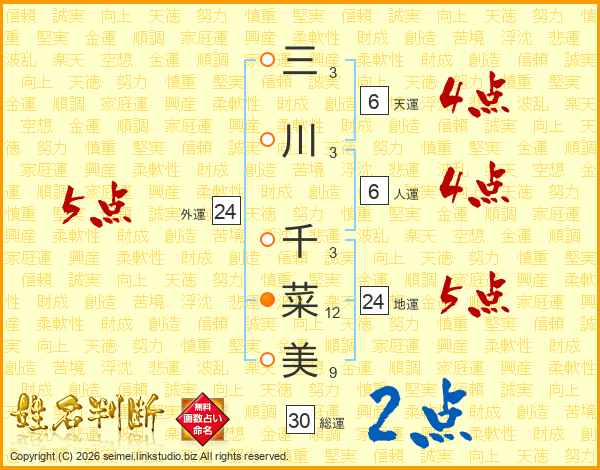 三(3画)川(3画) 千(3画)菜(12画)美(9画)