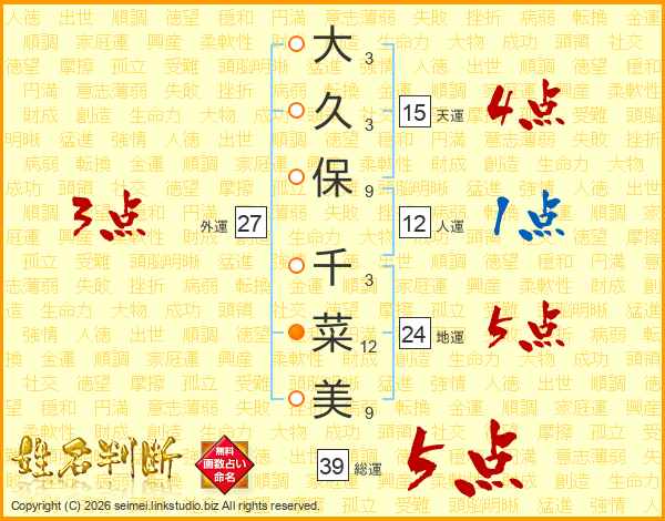 大久保千菜美さんの総運は39画の5点!