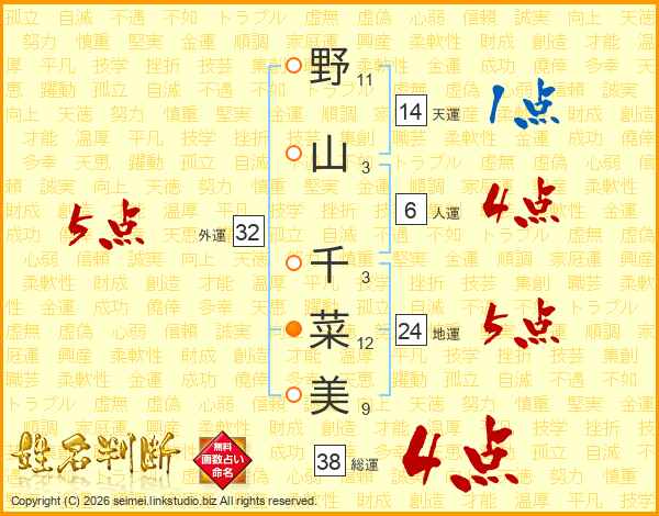 野山千菜美さんの総運は38画の4点!