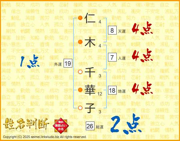仁(4画)木(4画) 千(3画)華(12画)子(3画)