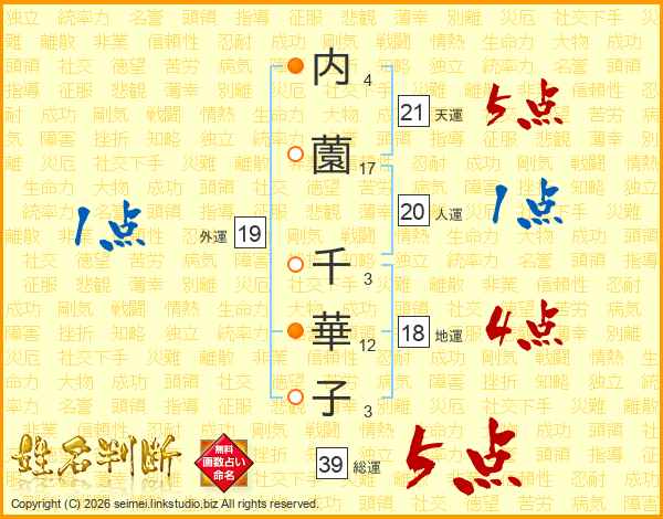 内(4画)薗(17画) 千(3画)華(12画)子(3画)