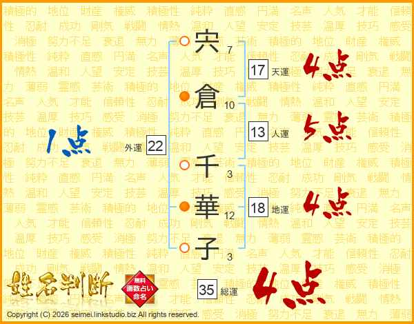 宍(7画)倉(10画) 千(3画)華(12画)子(3画)