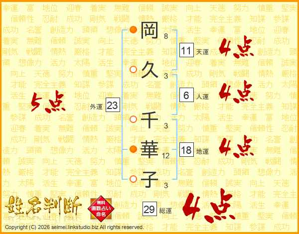岡(8画)久(3画) 千(3画)華(12画)子(3画)