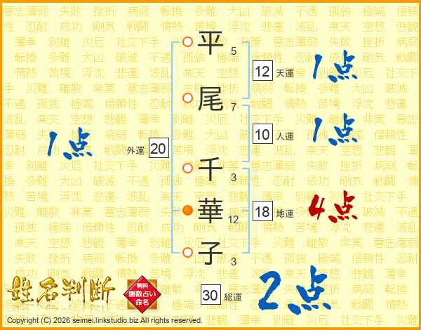 平(5画)尾(7画) 千(3画)華(12画)子(3画)