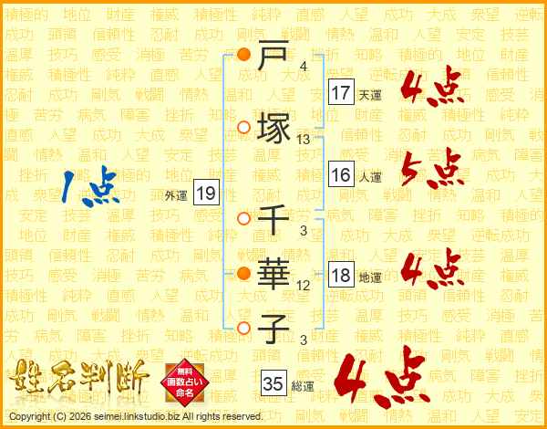 戸(4画)塚(13画) 千(3画)華(12画)子(3画)