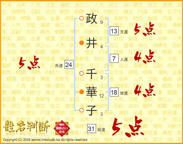 政(9画)井(4画) 千(3画)華(12画)子(3画)