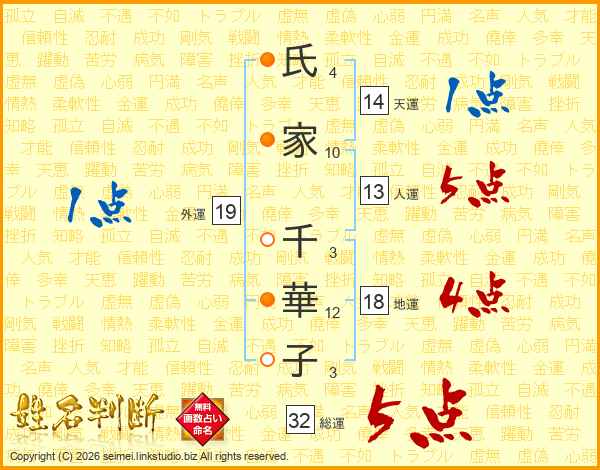 氏(4画)家(10画) 千(3画)華(12画)子(3画)