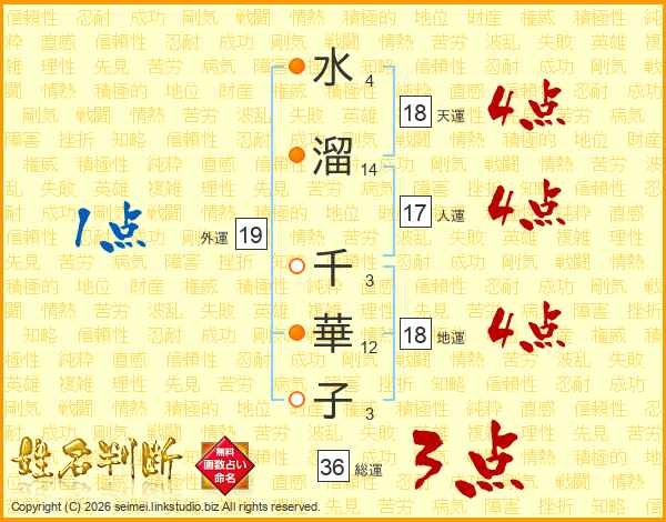 水(4画)溜(14画) 千(3画)華(12画)子(3画)