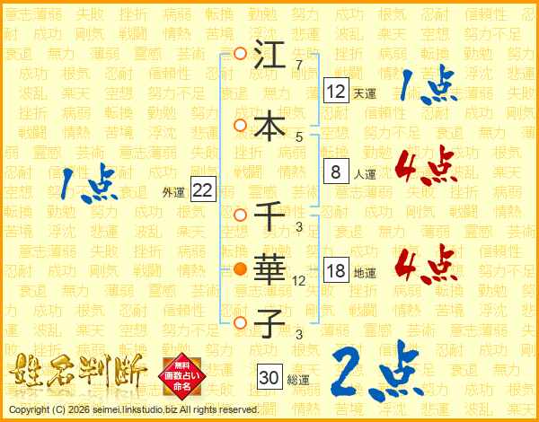 江(7画)本(5画) 千(3画)華(12画)子(3画)