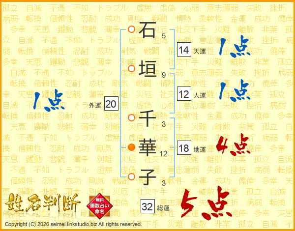 石(5画)垣(9画) 千(3画)華(12画)子(3画)