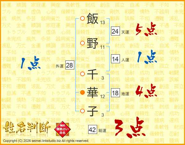 飯(13画)野(11画) 千(3画)華(12画)子(3画)