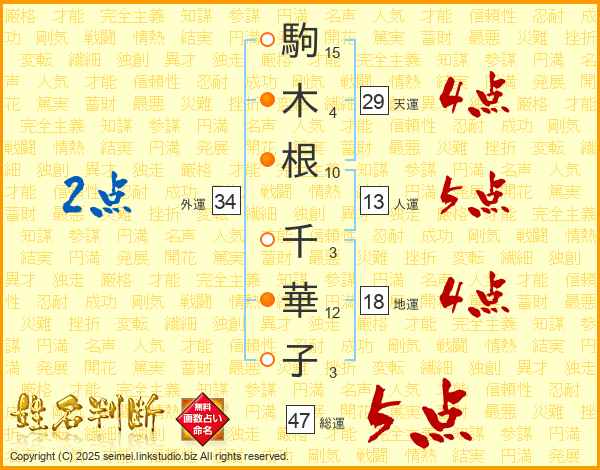 駒(15画)木(4画)根(10画) 千(3画)華(12画)子(3画)