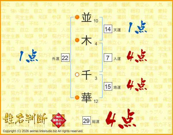 生活面を象徴する運勢です。外部から受ける影響力を表し、結婚運、家庭運や職場、環境への順応性を表します。総運から人運を引いた画数。姓や名が1文字の場合を除く。