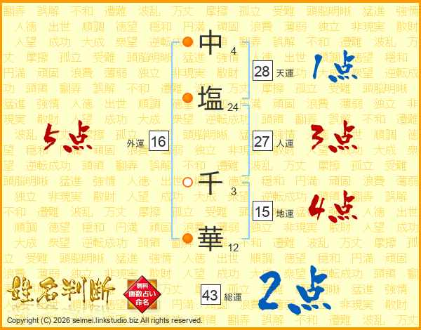 中(4画)塩(24画) 千(3画)華(12画)