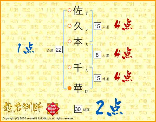 佐(7画)久(3画)本(5画) 千(3画)華(12画)