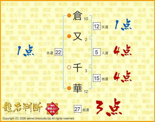 倉(10画)又(2画) 千(3画)華(12画)