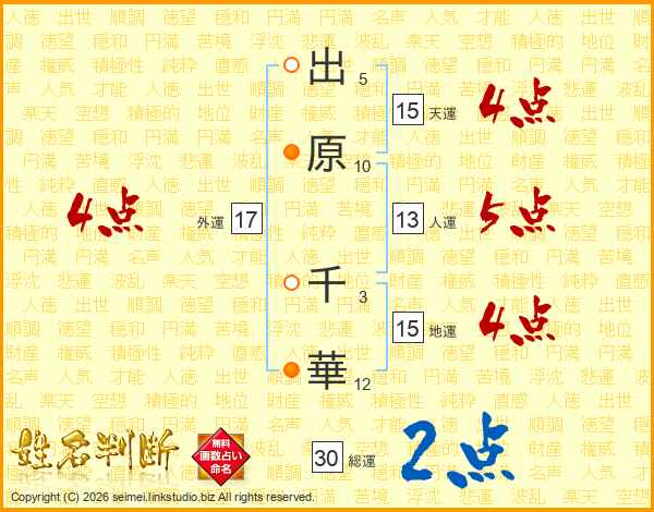 生活面を象徴する運勢です。外部から受ける影響力を表し、結婚運、家庭運や職場、環境への順応性を表します。総運から人運を引いた画数。姓や名が1文字の場合を除く。