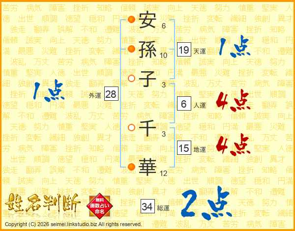 安(6画)孫(10画)子(3画) 千(3画)華(12画)