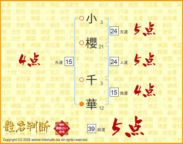 小櫻千華さんの総運は39画の5点!