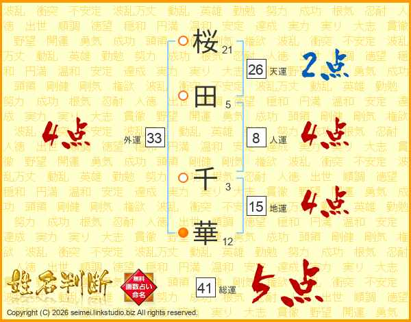 生活面を象徴する運勢です。外部から受ける影響力を表し、結婚運、家庭運や職場、環境への順応性を表します。総運から人運を引いた画数。姓や名が1文字の場合を除く。