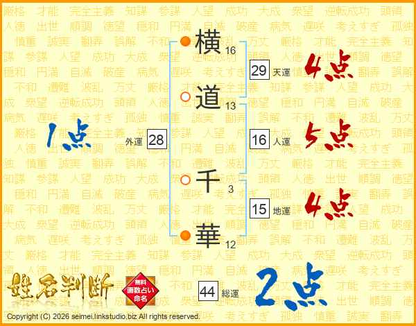 横道千華さんの総運は44画の2点!