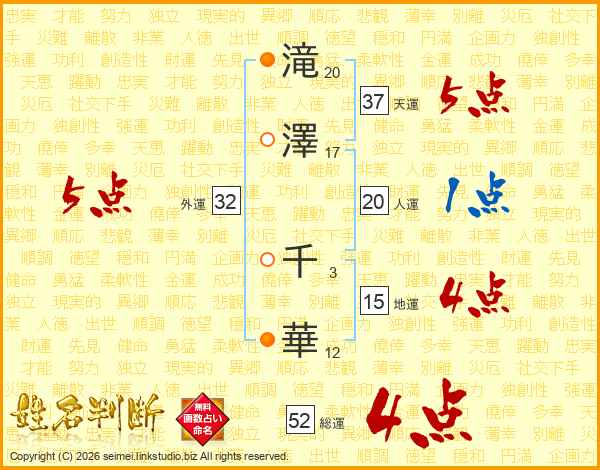 滝(20画)澤(17画) 千(3画)華(12画)
