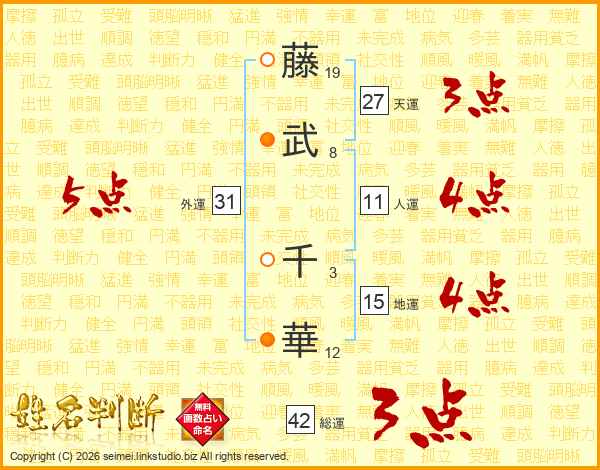 生活面を象徴する運勢です。外部から受ける影響力を表し、結婚運、家庭運や職場、環境への順応性を表します。総運から人運を引いた画数。姓や名が1文字の場合を除く。