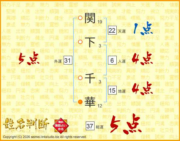 生活面を象徴する運勢です。外部から受ける影響力を表し、結婚運、家庭運や職場、環境への順応性を表します。総運から人運を引いた画数。姓や名が1文字の場合を除く。