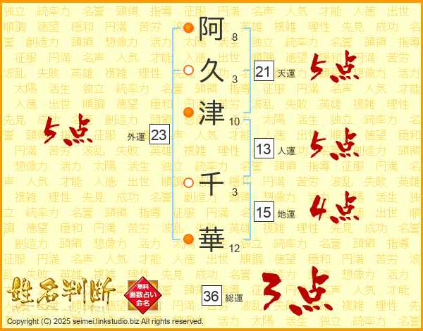 阿(8画)久(3画)津(10画) 千(3画)華(12画)
