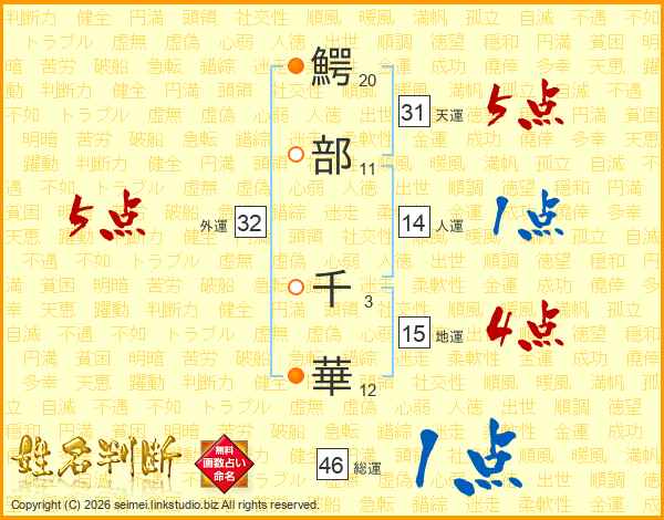 生活面を象徴する運勢です。外部から受ける影響力を表し、結婚運、家庭運や職場、環境への順応性を表します。総運から人運を引いた画数。姓や名が1文字の場合を除く。