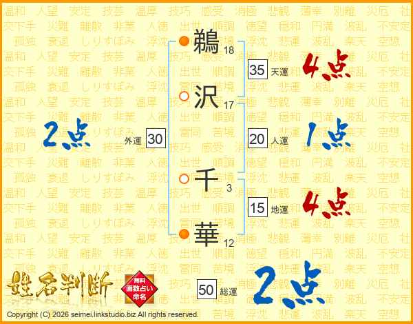 鵜(18画)沢(17画) 千(3画)華(12画)