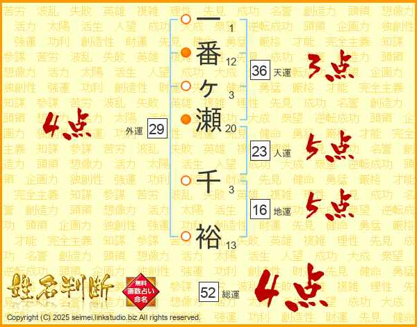 一番ヶ瀬千裕さんの総運は52画の4点!