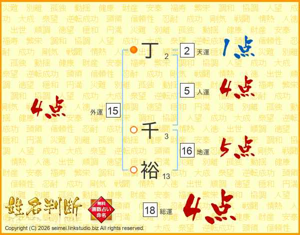 あなたの人生を表す1番重要な運勢です。生涯を通じて影響する総合運となり、主に50歳以降の晩年期に影響を及ぼします。苗字と名前の合計画数。