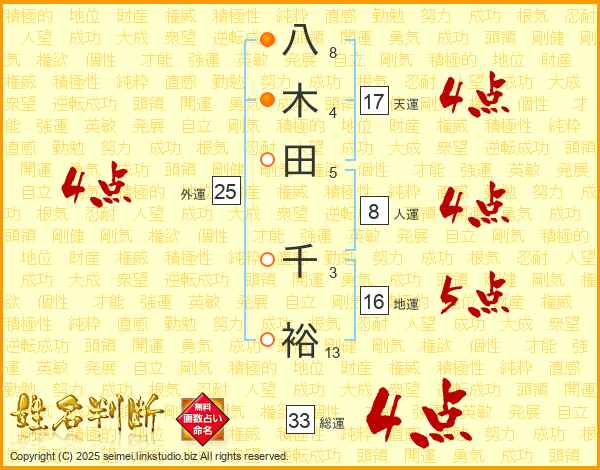 八(8画)木(4画)田(5画) 千(3画)裕(13画)
