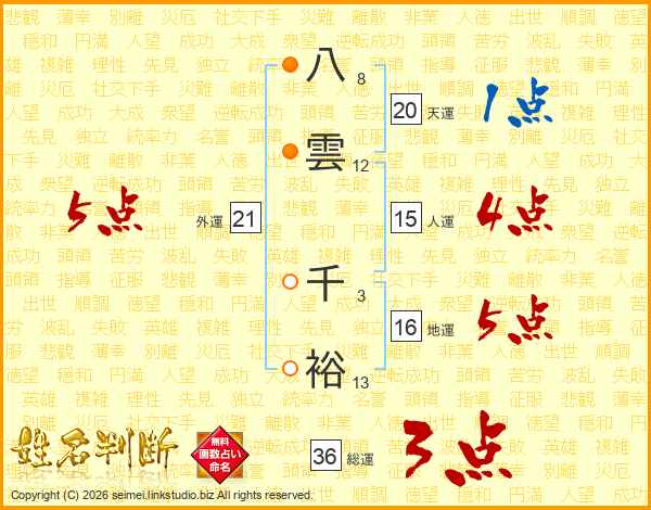 生活面を象徴する運勢です。外部から受ける影響力を表し、結婚運、家庭運や職場、環境への順応性を表します。総運から人運を引いた画数。姓や名が1文字の場合を除く。