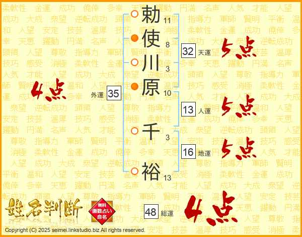 勅(11画)使(8画)川(3画)原(10画) 千(3画)裕(13画)