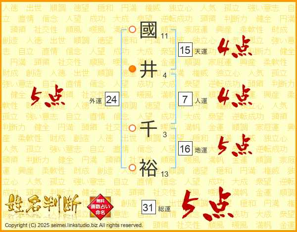 あなたの人生を表す1番重要な運勢です。生涯を通じて影響する総合運となり、主に50歳以降の晩年期に影響を及ぼします。苗字と名前の合計画数。