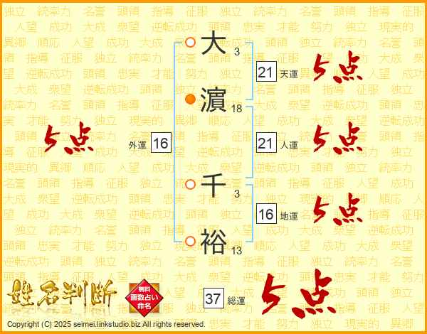 あなたの人生を表す1番重要な運勢です。生涯を通じて影響する総合運となり、主に50歳以降の晩年期に影響を及ぼします。苗字と名前の合計画数。