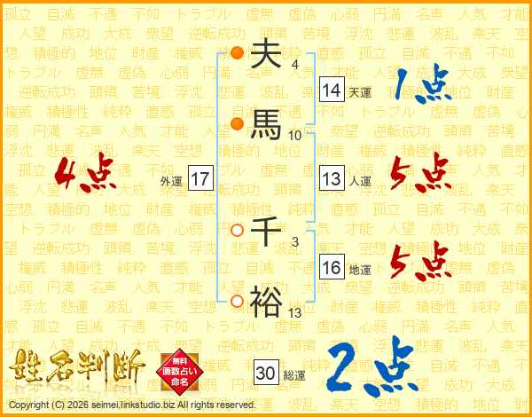 夫(4画)馬(10画) 千(3画)裕(13画)