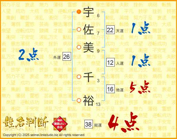 宇(6画)佐(7画)美(9画) 千(3画)裕(13画)