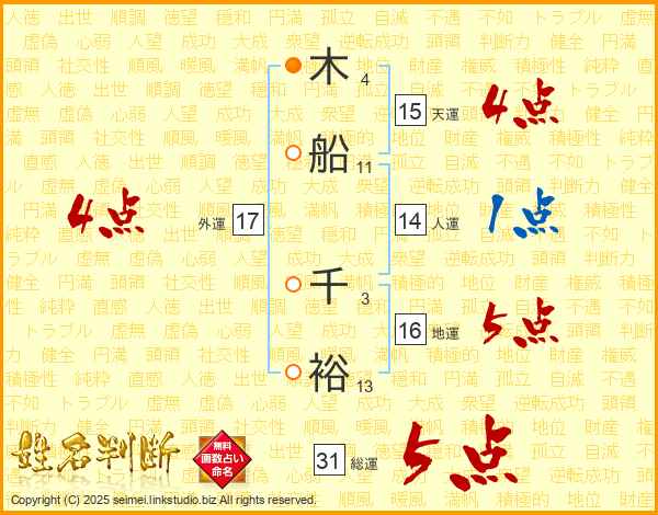 木(4画)船(11画) 千(3画)裕(13画)
