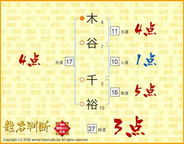 木(4画)谷(7画) 千(3画)裕(13画)