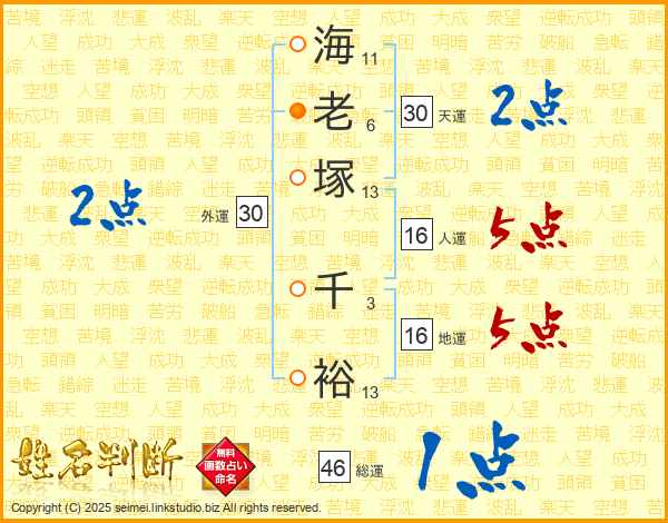 海(11画)老(6画)塚(13画) 千(3画)裕(13画)