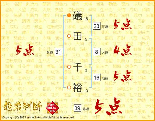 生活面を象徴する運勢です。外部から受ける影響力を表し、結婚運、家庭運や職場、環境への順応性を表します。総運から人運を引いた画数。姓や名が1文字の場合を除く。