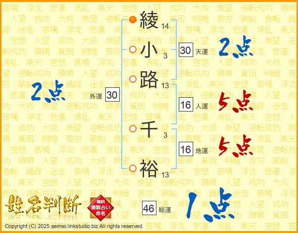 綾(14画)小(3画)路(13画) 千(3画)裕(13画)
