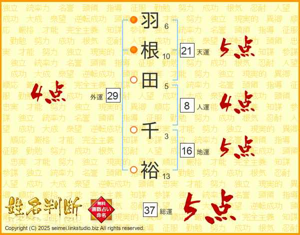 羽(6画)根(10画)田(5画) 千(3画)裕(13画)
