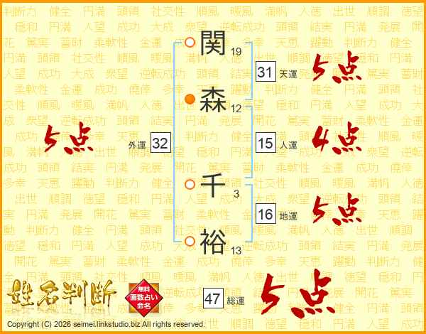 関森千裕さんの総運は47画の5点!