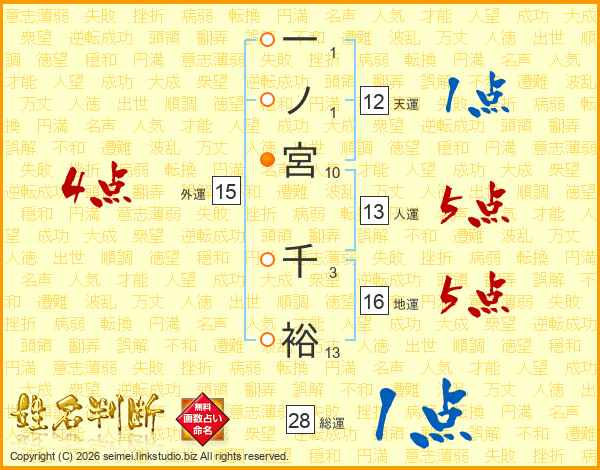 一(1画)ノ(1画)宮(10画) 千(3画)裕(13画)
