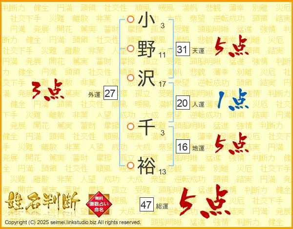 小野沢千裕さんの総運は47画の5点!