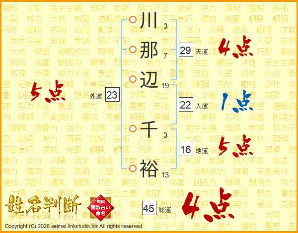 川(3画)那(7画)辺(19画) 千(3画)裕(13画)